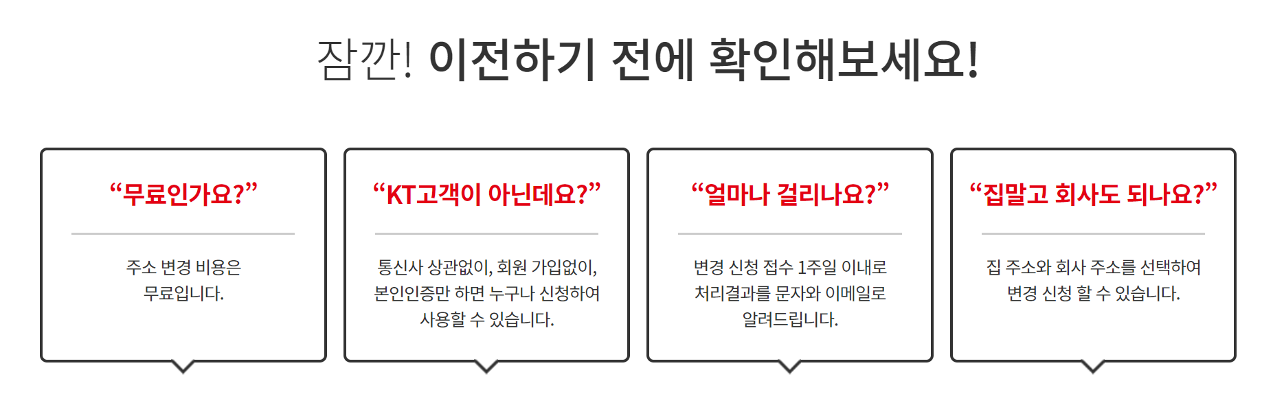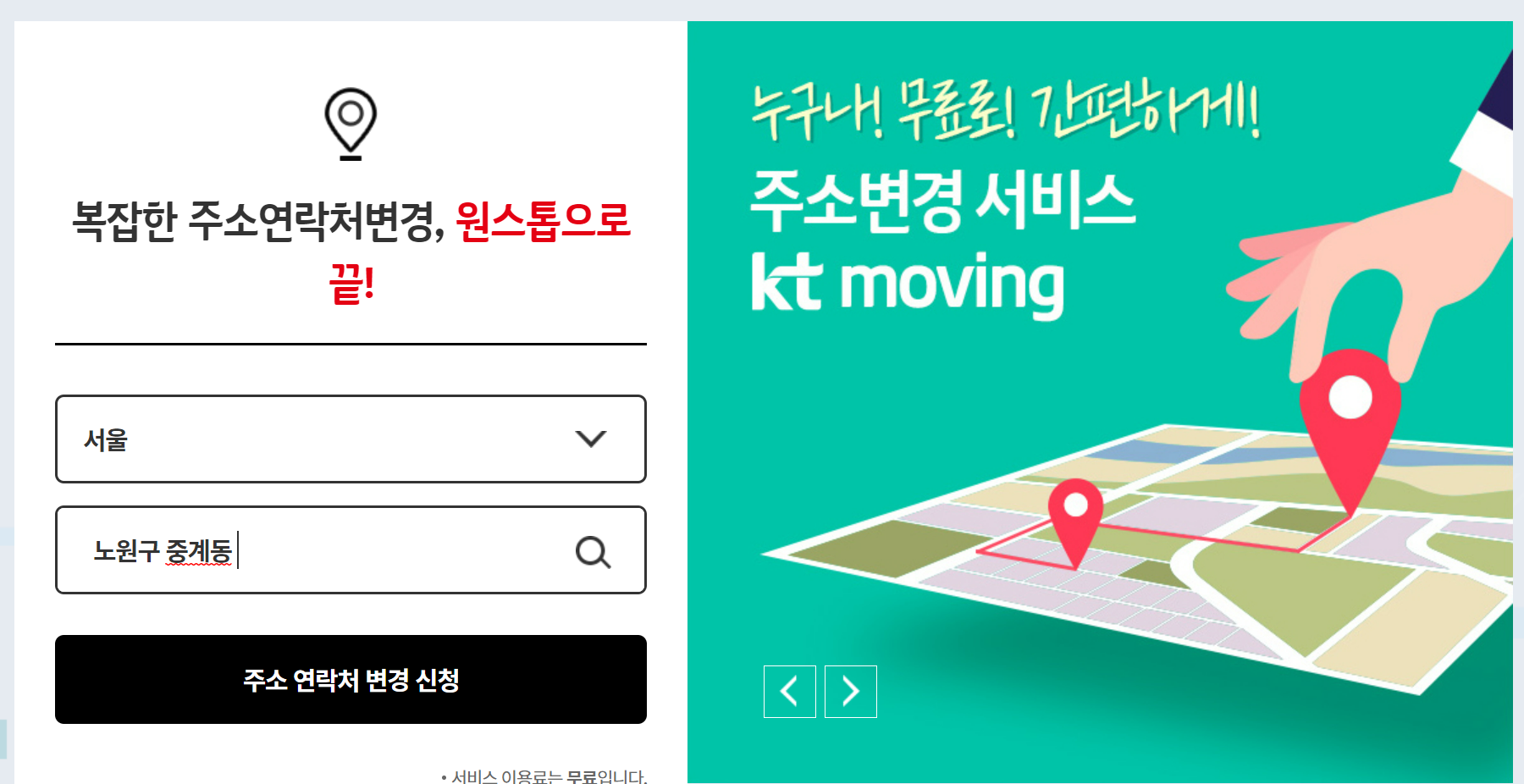 이사, 이직으로 인한 은행,카드,보험등 번거로운 주소변경 무료로 한번에 변경하세요. ktmoving 주소변경서비스는 누구나 무료로 간편하게 한번의 신청으로 원하시는 곳의 주소를 변경해 드립니