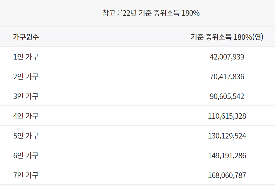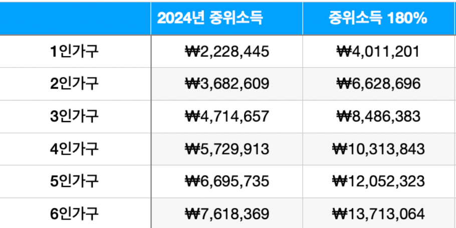 중위소득 180%는 2024년 중위소득에 1.8을 곱해준 값입니다.