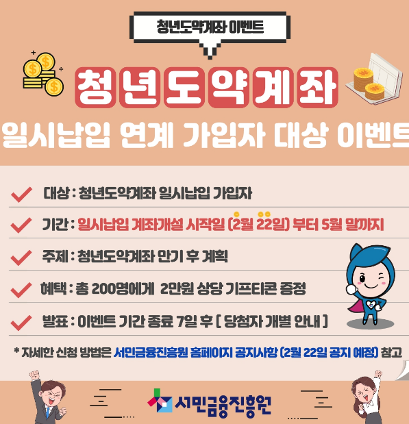 물가가 많이 오르는 건 주부들이 제일 빨리 체감할 수 있죠. 집에서 부모님의 보살핌 속에 생활하던 자녀들이 이제 고등학교를 졸업하고 청년이 되는 순간 체감하는 물가와 생활비는 감당하기 어려울 만큼 이라고들 얘기하죠. 그래서 이것도 포기하고 저것도 포기하는 청년들이 많다죠. 나라에서 국가적 차원에서 청년들을 위한 대책을 많이 마련하고 있어요. 2년 전 청년희망적금의 만기 시기가 이제 올해였고 새롭게 청년도약계좌를 내놓았네요. 오늘은 청년도약계좌를 소개해볼게요.
