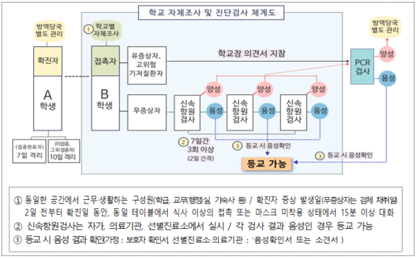 ㅇ 학교 내 확진자 발생 시, 방역당국에서 제시한 기준에 맞춰 학교가 자체적으로 접촉자를 분류하여 신속항원검사 또는 피시알(PCR) 검사를 지원하는 등 상황에 맞게 대응하게 됩니다.