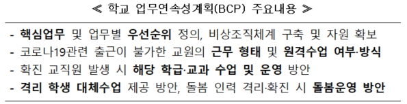 ㅇ 아울러, 학교별로 업무 연속성 계획(BCP : Business Continuity Plan)을 수립하도록 하여 교직원 확진자 급증 시에도 필수교육활동이 지속될 수 있도록 비상대응 체계를 마련하도록 합니다.