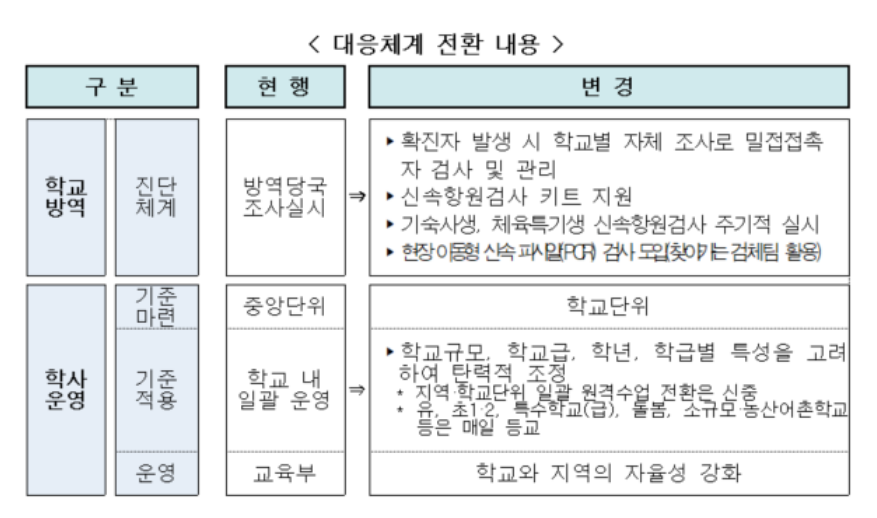 이번 방안은 오미크론의 특성, 방역당국의 방역체계 전환 기조 등을 반영하여 학교의 방역 및 학사운영 체계를 전면 정비함으로써, 오미크론 확산 등 비상상황 발생 시 지역과 학교 중심의 신속한 대응체계를 구축하는 데 주안점을 두었습니다.