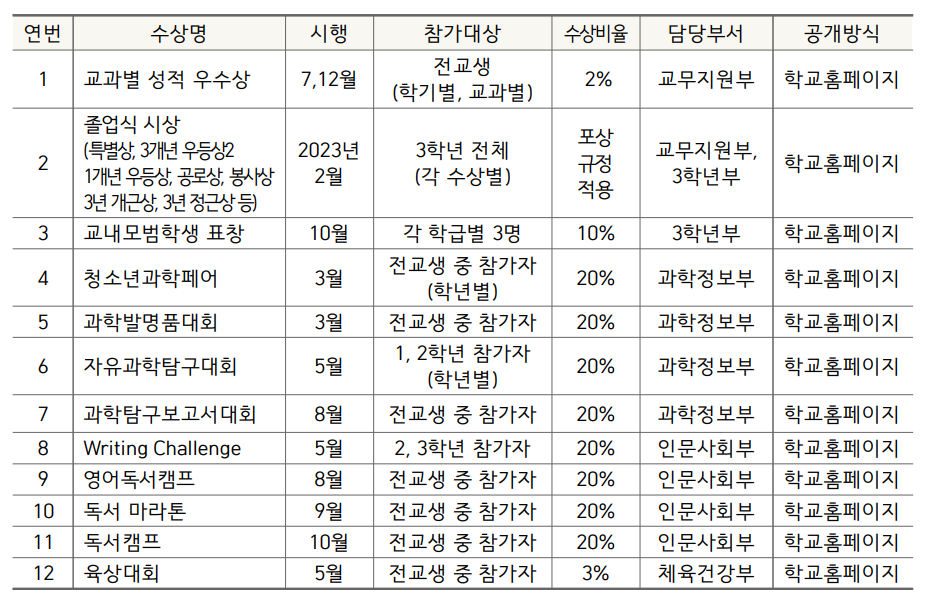 다양한 시상계획을 통해 참가자별로 수상 비율을 달리해 참여를 독려하는 행사와 우수자를 선발하는 행사를 확인할 수 있습니다. 다양한 경험을 통해 준비하고 발표하는 과정에서 학생들의 자기 주도 능력이 신장되어 우수한 진학결과로 이어지는 발판이 된다고 보입니다.