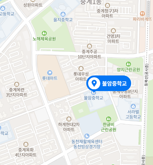 대림벽산, 청구 3차, 건영 3차, 롯데우성, 하계 현대 2차, 청구 라이프 신동아, 중계주공 8단지, 중계주공 10단지에서 추첨으로 배정됩니다. 하계 현대 2차는 100% 불암중으로 배정되었던 해도 있었다고 하네요. 은행사거리 주요 지역 아파트 어디에서도 가까이에 걸어서 10분에서 15분 사이로 다닐 수 있는 중학교는 많습니다. 그중에서도 불암중은 엄마들이 선호하는 학교입니다.