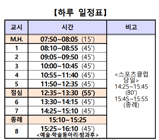 다른 중학교에 비해 등교가 빠른 빠른 편입니다. 스쿨버스를 운행하니 출근시간을 피해야 해서 그런 것 같습니다.