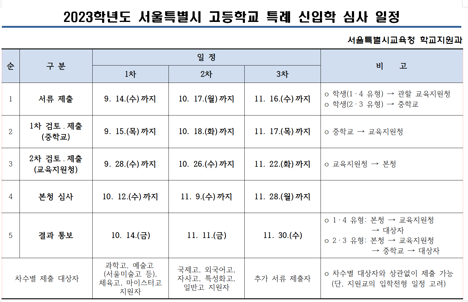 더욱 자세한 내용은 2023학년도 서울특별시 고등학교 특례 신입학 업무 처리 지침을 통해 확인해보시기 바랍니다.