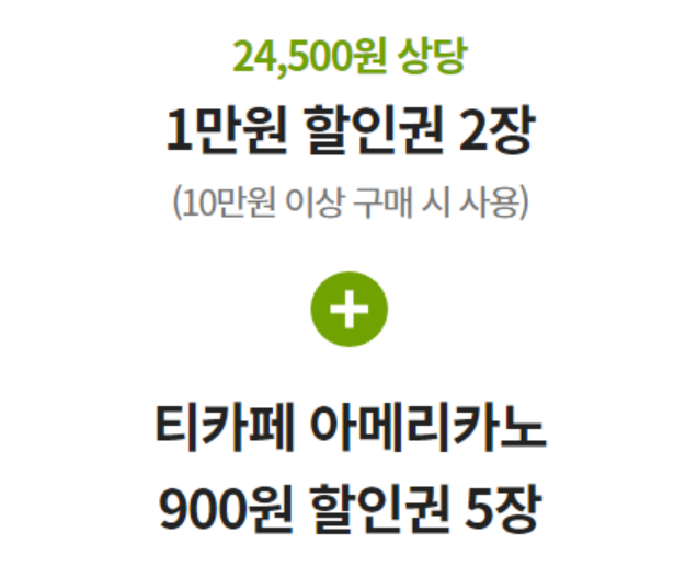 10만 원 이상 구매 시 사용할 수 있는 1만 원 할인권 2장과 티카페 아메리카노 900원 할인권 5장을 합해 총 24,500원 상당의 월컴쿠폰이 제공된다.